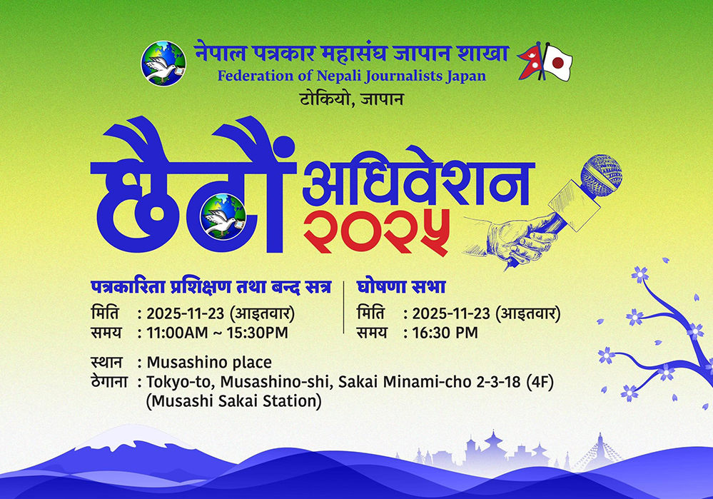 नेपाल पत्रकार महासंघ जापान शाखाको छैठौं अधिवेशन यहि नोवेम्वर २३ तारिख आइतवारका दिन टोकियोमा हुने भएको छ । अधिवेशनबाट आगामी ३ वर्षको कार्यकालका लागि नयाँ नेतृत्वसहित नयाँ कार्यसमिति निर्माण गर्नुका साथै भावी कार्ययोजना तथा मार्गचित्र तय गरिने बताईएको छ । शाखाका अध्यक्ष शान्त पहरीका अनुसार अधिवेशनको सबै तैयारी पूरा भईसकेको छ भने नयाँ कार्यसमिति निर्माण प्रक्रिया सम्पन्न गर्न खगराज गौतमको संयोजकत्वमा ३ सदस्यीय निर्वाचन समिति गठन गरिएको छ । निर्वाचन समितिको सदस्यहरुमा पूर्ण चलाउने र खड्कसिंह गुरुङ रहेका छन् ।
