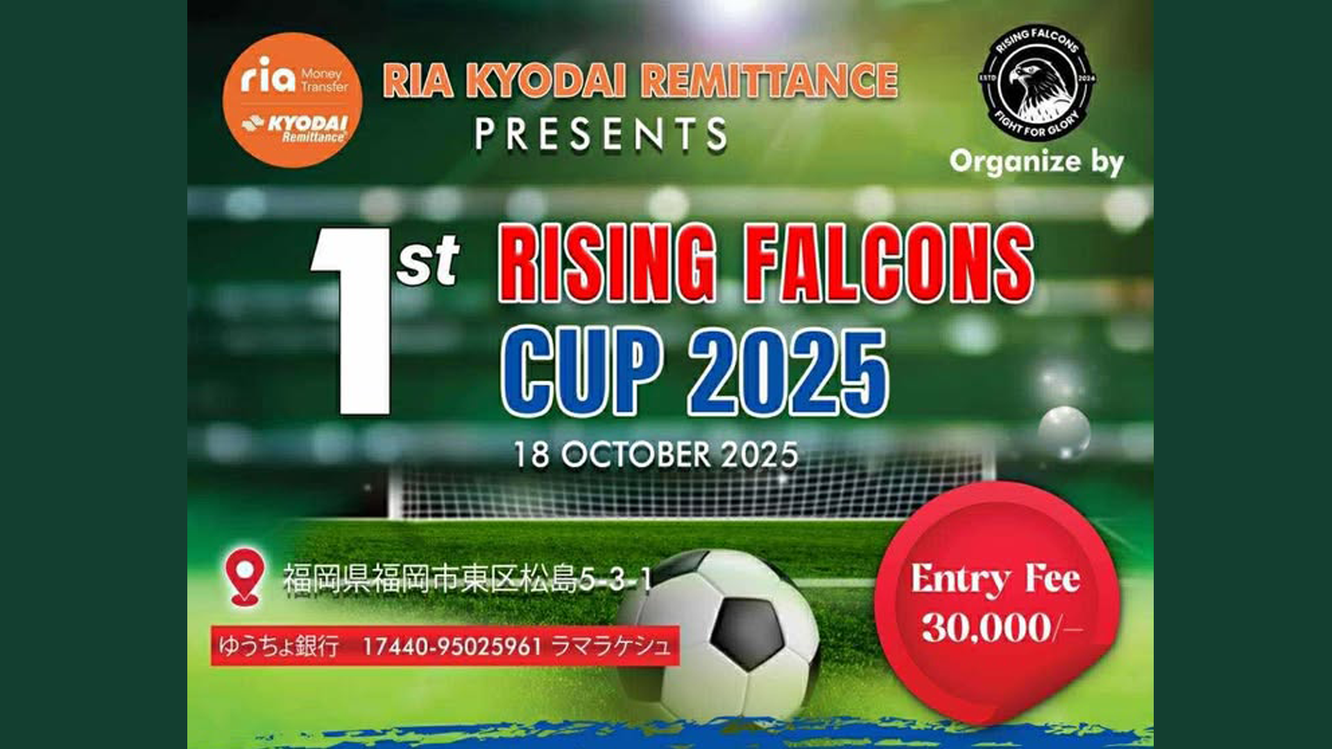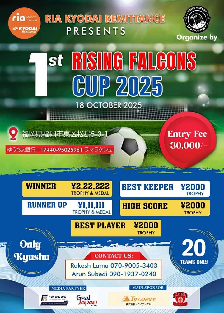 फुकुओकामा रिया क्योदाई रेमिटयान्स प्रिजेन्ट प्रथम राइजिङ्ग फाल्कोन कप २०२५ मिति २०२५ अक्टोबर १८ तारीकका दिनमा हुने भयको छ । जापानको फुकुओकामा राइजिङ्ग फाल्कोन फुटबल कल्वले क्युस्युमा भएका फुटसल टिमहरुको सहभागीतामा प्रतियोगीता आयोजना गर्न लागेको छ । प्रतियोगीताको आयोजना तयारी अन्तिम चरणमा पुगेको जानकारी कल्बका म्यानेजर राकेश लामाले जानकारी दिनु भयो ।