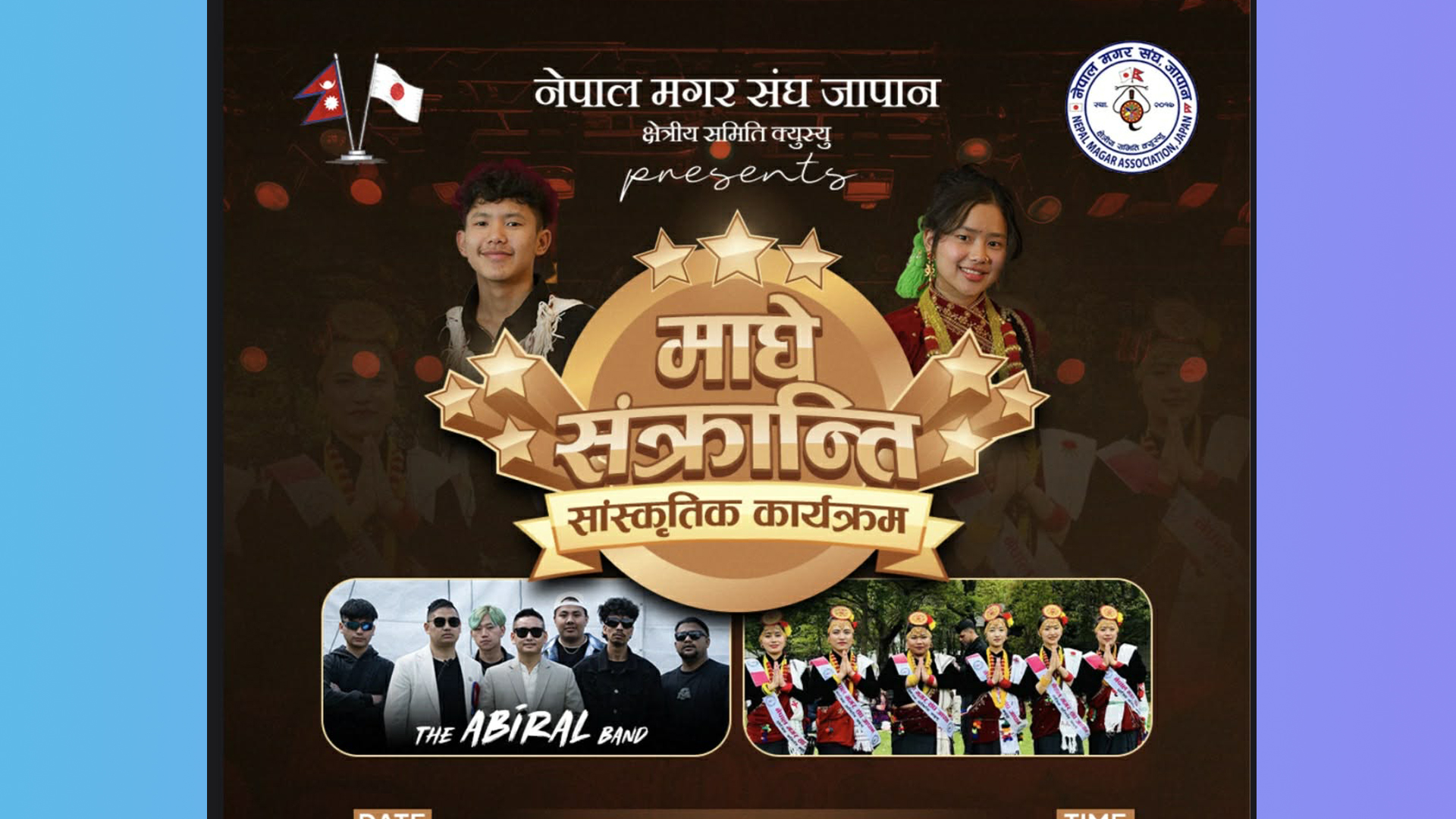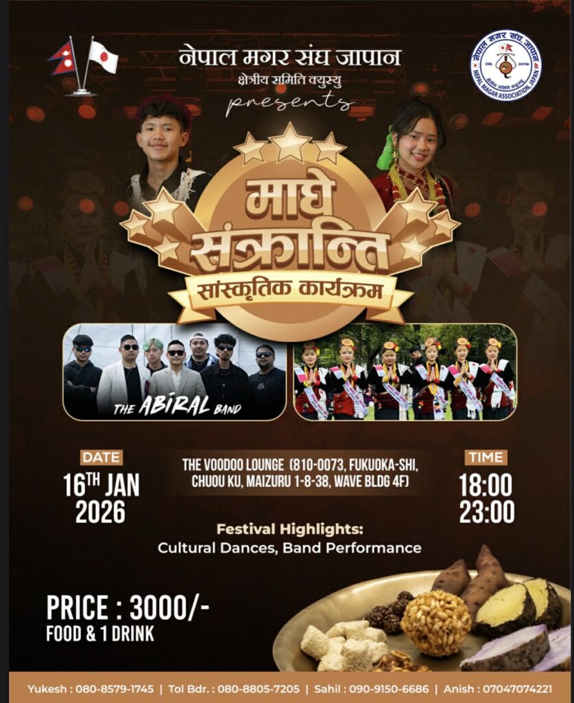 विगतका समयबाट नै माघे सक्रान्तिको अवसरमा विभीन्न कार्यक्रमहरु गर्दै आइरहेको नेपाल मगर संघ जापान क्षेत्रिय कार्यसमिति क्युस्युले यस वर्ष पनि माघे सक्रान्तिको अवसरमा माघे सक्रान्ति सांस्कृतिक कार्यक्रमको आयोजना २०२६ जनवरी १६ तरीक शुक्रबारका दिन फुकुओकाको भोडो लजमा गर्न लागेको छ । उक्त कार्यक्रमलाई भव्यताका साथ सम्पन्न गर्नका लागी फुकुओकाको अबिरल व्यान्ड र अन्य स्थानिय कलाकारहरुको बेजोड प्रस्तुती रहने नेपाल मगर संघ जापान क्षेत्रिय कार्यसमिति क्युस्युका संयोजक युकेस रानाले बताउनु भयो ।