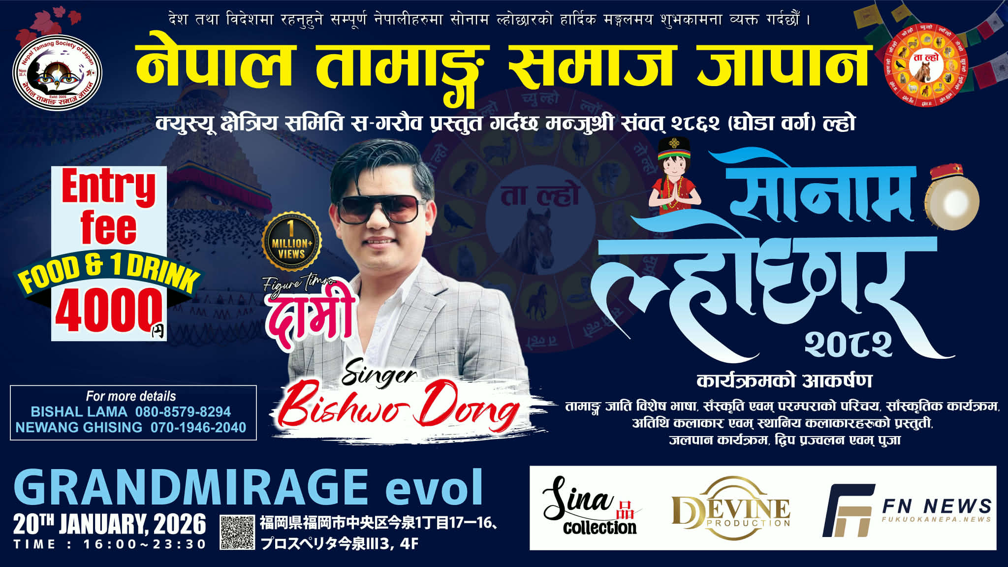 विगतका समयबाट नै सोनाम ल्होसारको अवसरमा विभीन्न कार्यक्रमहरु गर्दै आइरहेको तामाङ्ग समाज क्युस्युले यस वर्ष पनि सोनाम ल्होसारको अवसरमा ल्होसार वृहत सांस्कृतिक कार्यक्रमको आयोजना २०२६ जनवरी २० तरीक मंगलबारका दिन फुकुओकाको ग्राण्ड मिराज ओभलमा गर्न लागेको छ । उक्त कार्यक्रमलाई भव्यताका साथ सम्पन्न गर्नका लागी कलाकारहरु विश्व दोङ फुकुओका आउन लागेको तामाङ्ग समाज क्युस्युका सचिब बिसाल जिम्बाले बताउनु भयो ।