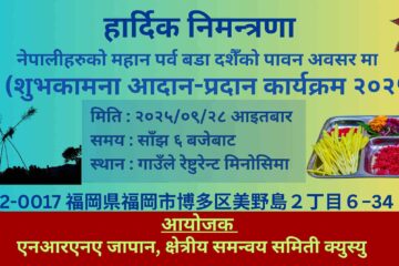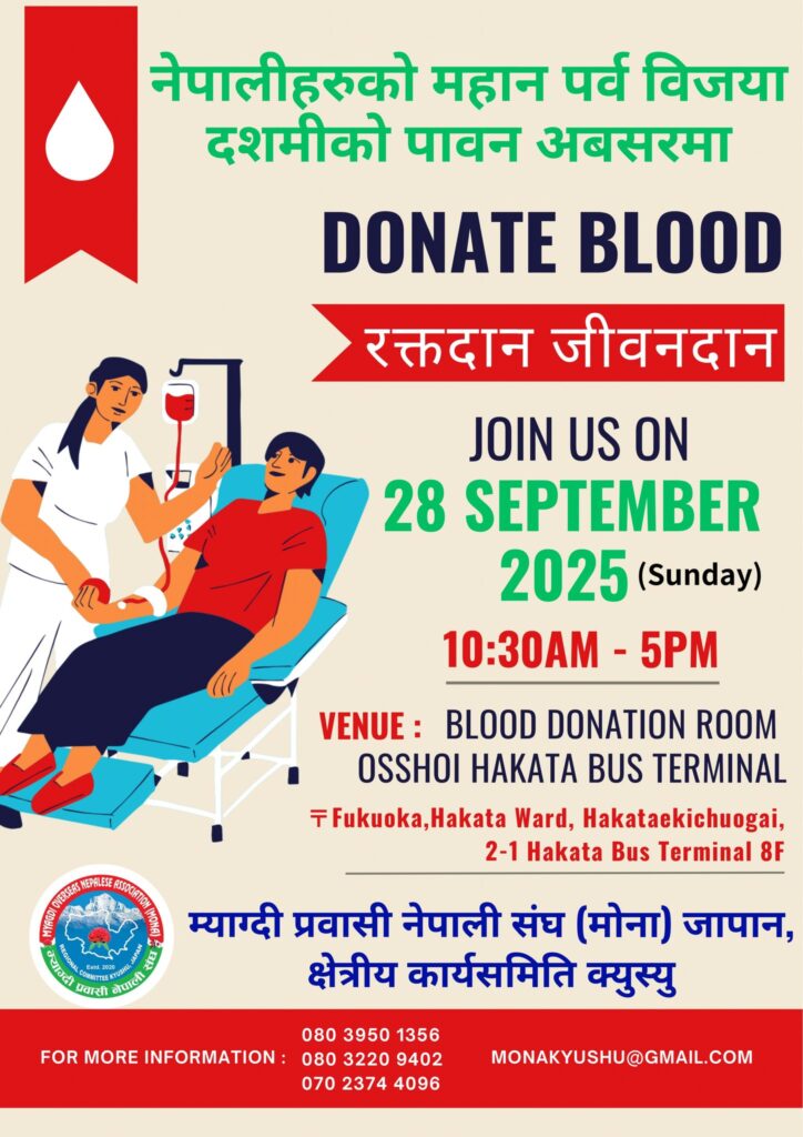 म्याग्दी प्रवासी नेपाली संघ (मोना) जापान क्षेत्रीय कार्यसमिति क्युस्युले नेपालीहरुको महान चाड विजया दशमी २०८२ को पावन अवसरमा फुकुओकामा सेप्टेम्बर २८ तारीक आइतबारका दिन रक्तदान जिवनदान भन्ने मुल नारा सहीत रक्तदान कार्यक्रम आयोजना गर्न लागेको जानकारी मोना क्युस्युका संयोजक बिजी बानियाँले बताउनु भयो । देशमा होस या परदेशमा सुखमा होस या दुखमा जहाँ पनि समाजसेवामा अग्रसर रहेको मोनाको एक अंग भै क्षेत्रीय समिति मार्फत कार्यक्रमहरु गर्न पाउदा अत्यन्तै खुसी व्यक्त गर्दै हाल सम्म गर्दै आएका कार्यक्रमहरु लाई निरन्तरताका साथै समयानुकुल कार्यक्रमहरु पनि गर्दै अगाडी बड्ने योजना रहेको संयोजक बानियाँले बताउनु भयो ।