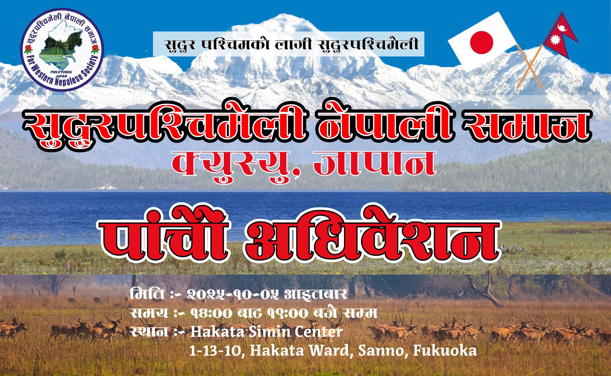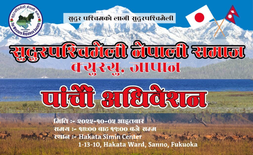 सुदूरपश्चिमेली नेपाली समाज, जापान क्युस्यू क्षेत्रिय समितिले पाँचौ अधिवेशन फुकुओका सहरमा यही २०२५ अक्टोबर ५ तारिक (आइतबार)का दिन गर्ने गरी तयारी अन्तिम चरणमा पुगेको संस्थाका संयोजक कविराज अवस्थीले जानकारी दिनुभयो । (सुदूरपश्चिमका लागि सुदुरपस्चिमेली) भन्ने मुलनाराका साथ गठन भयको संस्थाले विश्वका विभिन्न देश लगायत जापानको विभिन्न सहरमा क्षेत्रिय समिति गठन गरी कार्यहरू अगाडि बढाई रहेको छ ।